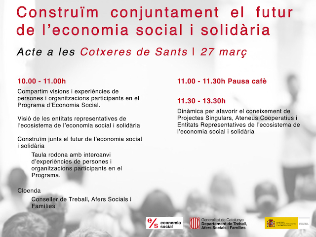 El proper 27 de març tindrà lloc la sessió d’intercanvi del Programa d’Economia Social i la Xarxa d’Ateneus Cooperatius Construïm conjuntament el futur de l’Economia Social i Solidària a les 10.00ha les Cotxeres de Sants amb la presència de l’Hble. conseller del Departament de Treball, Afers Socials i Famílies, Chakir el Homrani.