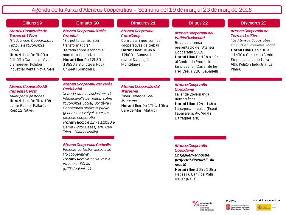 A continuació podeu veure l’agenda prevista per a la setmana del 19-23 de març. També podeu consultar l’agenda aracoop on trobareu tota la informació.