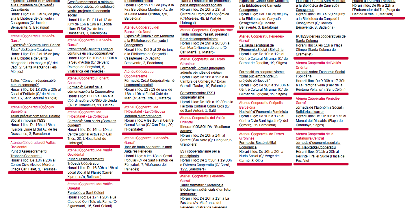 A continuació podeu veure l’agenda prevista per a la setmana del 10 al 16 de juny. També podeu consultar l’agenda aracoop on trobareu tota la informació.