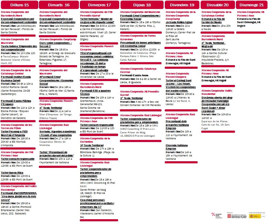 La Xarxa d’Ateneus Cooperatius organitza activitats de formació i acompanyament per a la millora de les empreses d’economia social, cooperativa i el tercer sector. A continuació podeu veure l’agenda prevista per a la setmana del 8 al 14 d’octubre. També podeu consultar l’agenda aracoop on trobareu tota la informació.