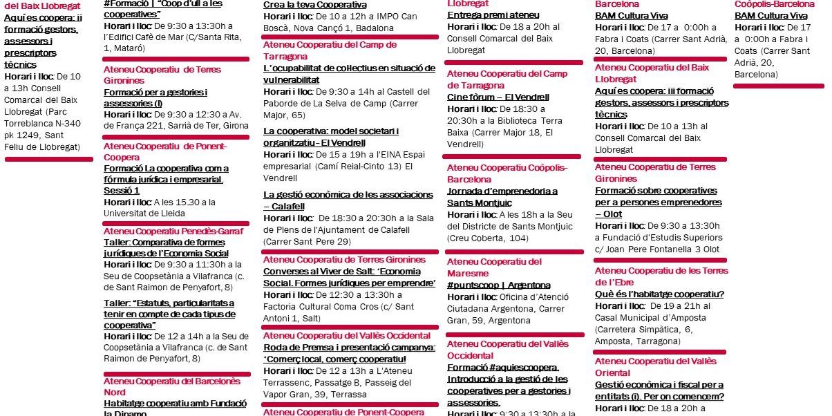 A continuació podeu veure l’agenda prevista per a la setmana del 17 al 23 de setembre. També podeu consultar l’agenda aracoop on trobareu tota la informació.