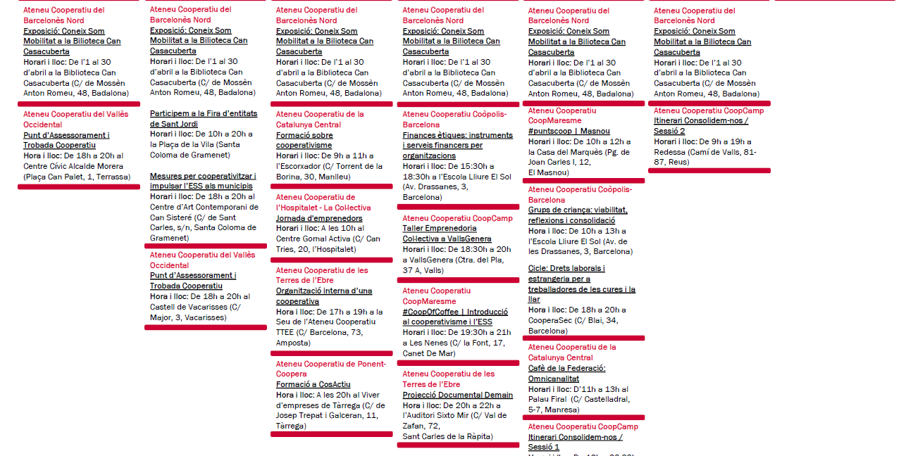 A continuació podeu veure l’agenda prevista per a la setmana del 22 al 28 d’abril. També podeu consultar l’agenda aracoop on trobareu tota la informació.
