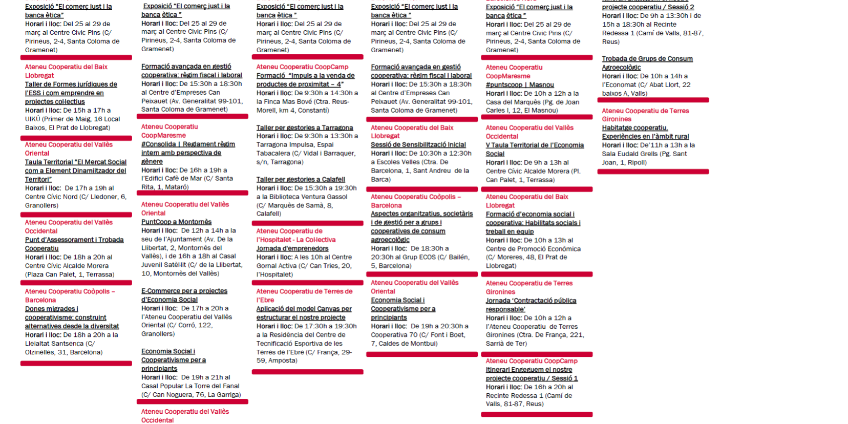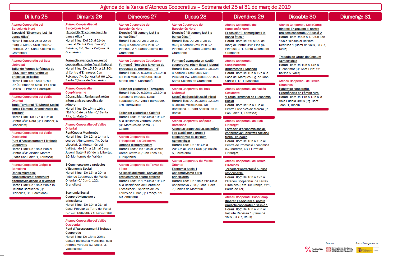 A continuació podeu veure l’agenda prevista per a la setmana del 24 al 31 de març. També podeu consultar l’agenda aracoop on trobareu tota la informació.