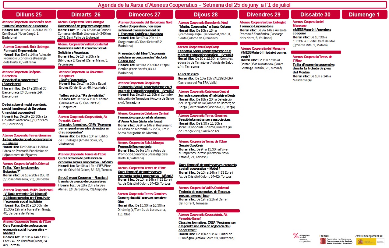 A continuació podeu veure l’agenda prevista per a la setmana de 14 de juny a l’1 de juliol. També podeu consultar l’agenda aracoop on trobareu tota la informació.