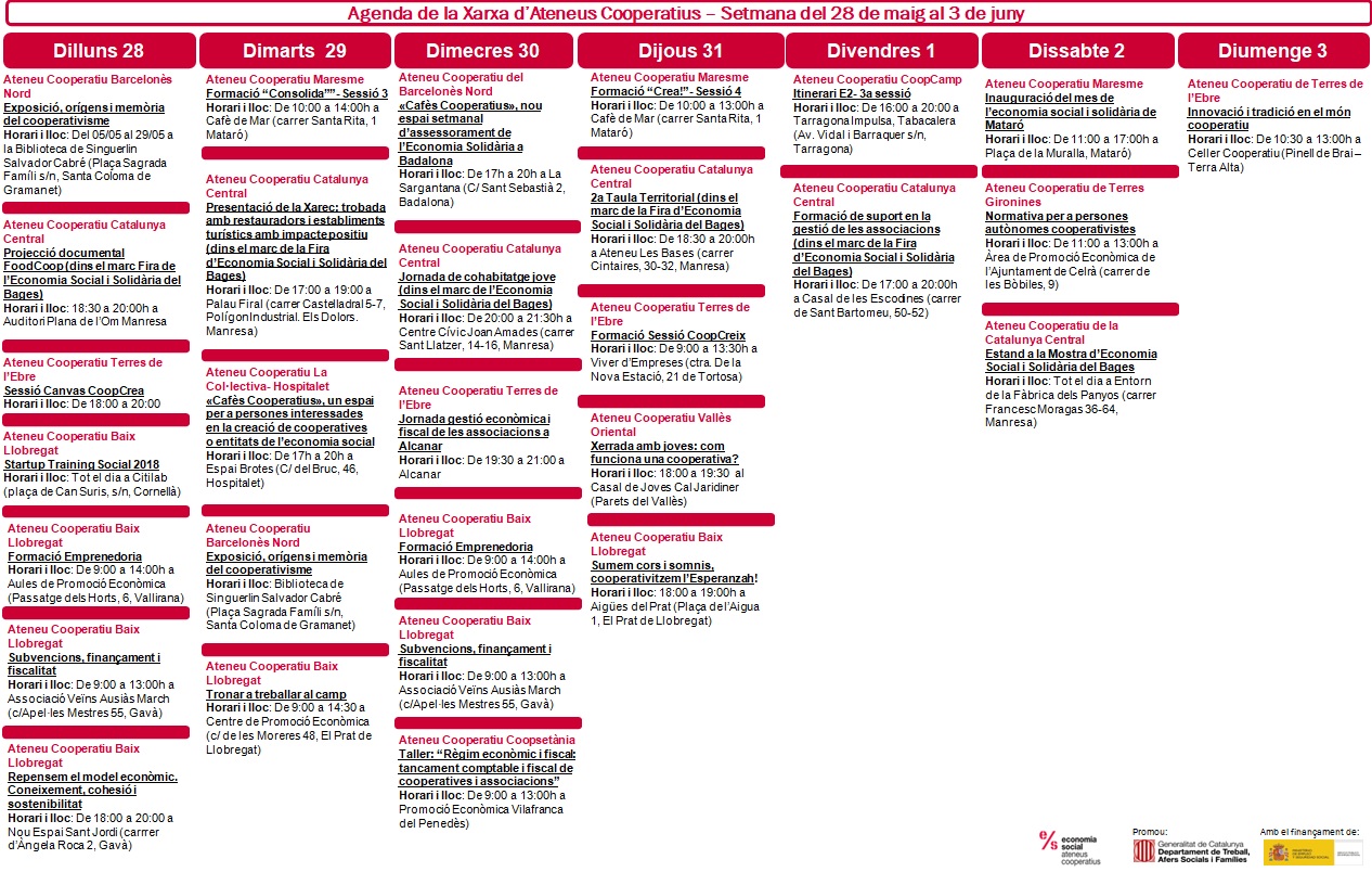 A continuació podeu veure l’agenda prevista per a la setmana 28 de maig al 3 de juny. També podeu consultar l’agenda aracoop on trobareu tota la informació.