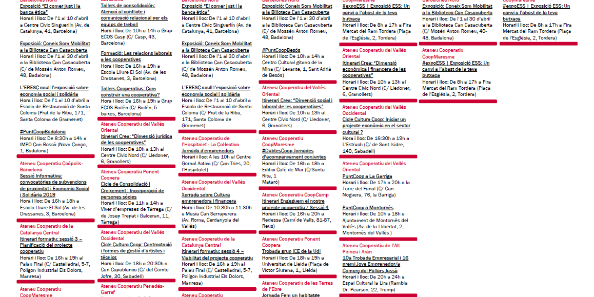 A continuació podeu veure l’agenda prevista per a la setmana del 8 al 14 d’abril. També podeu consultar l’agenda aracoop on trobareu tota la informació.