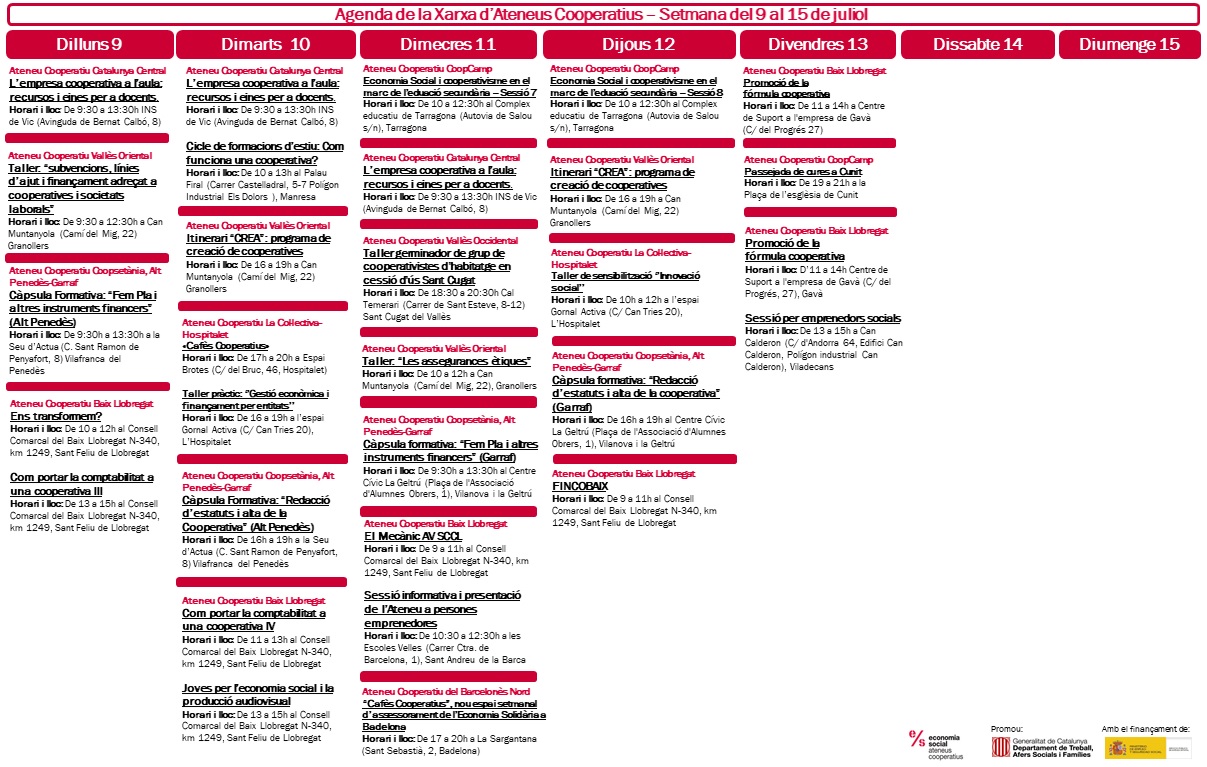A continuació podeu veure l’agenda prevista per a la setmana del 9 al 15 de juliol. També podeu consultar l’agenda aracoop on trobareu tota la informació.