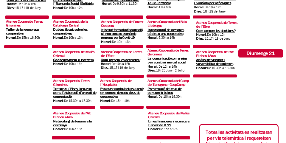 La Xarxa d’Ateneus Cooperatius organitza activitats de formació i acompanyament per a la millora de les empreses d’economia social, cooperativa i el tercer sector.Davant la situació de crisi provocada per la Covid-19 i per tal de contribuir a frenar la propagació de la malaltia, la Xarxa d’Ateneus Cooperatius ha adaptat les activitats previstes a un format digital. Alhora, s’han preparat nous continguts a fi de donar resposta a l’impacte social d’aquesta situació excepcional des de la realitat de cada territori.
