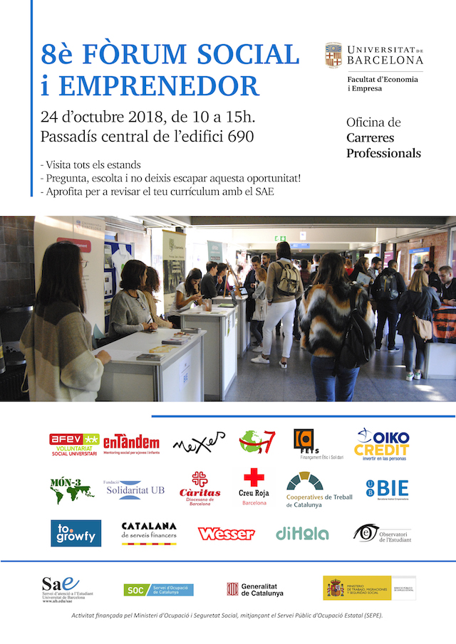 El proper dimecres 24 d’octubre, de 10 h a 15 h, tindrà lloc el VIII Fòrum Social i Emprenedor al passadís central de l’edifici 690. Es tracta d’un esdeveniment molt important per a la Facultat, que aplega entitats d’economia social i projectes emprenedors amb l’objectiu de mostrar als estudiants uns sectors que, a més de contribuir socialment, són vies potencials d’inserció laboral.