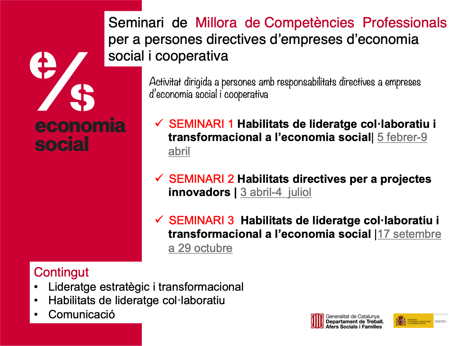 Si vols millorar com a professional de l’economia social, no ho dubtis i apunta’t a aquests seminaris que segur s’adaptaran a les teves necessitats, ja que busquen, precisament, l’aplicabilitat immediata de tots els continguts que s’imparteixen. Alhora, podràs compartir experiències i valors cooperatius entre la resta de d’assistents.