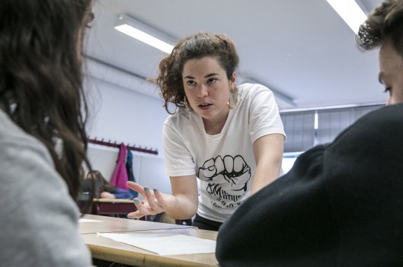 Alba «Bittah» impartint un dels tallers de rap de Versembrant a l’escola Vedruna Gràcia de Barcelona. Foto: Versembrant