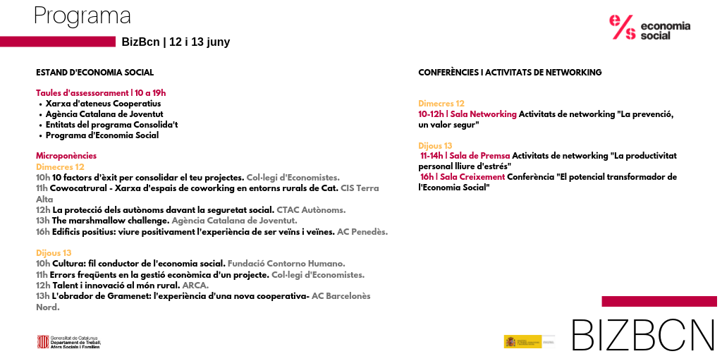 Els propers dies 12 i 13 de juny se celebra el BIZBarcelona, l’esdeveniment de referència a Catalunya en emprenedoria i pime, i com cada any l’Economia Social hi serà present.